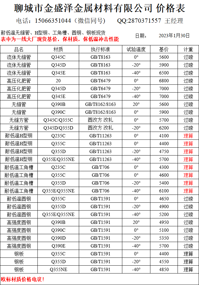 聊城市金盛澤金屬材料有限公司主營低合金/耐低溫?zé)o縫管,方矩管,H型鋼,工字鋼,角鋼,槽鋼,圓鋼,鋼板;現(xiàn)貨供應(yīng):大無縫、包鋼、煙寶、鳳寶正品耐低溫?zé)o縫管,專業(yè)加工生產(chǎn)無縫方矩管;經(jīng)營一線品牌型材:萊鋼/包鋼/馬鋼/日鋼 耐低溫Q235B/C;Q355B/C/D/NE H型鋼(100*100-1000*300) 偏型號H型鋼鋼現(xiàn)貨:250/255,248/124,344/348,394/398,506/201,606/201,458/417,912/302,692/300,792/300 ;萊鋼/馬鋼/宣鋼產(chǎn) 耐低溫槽…